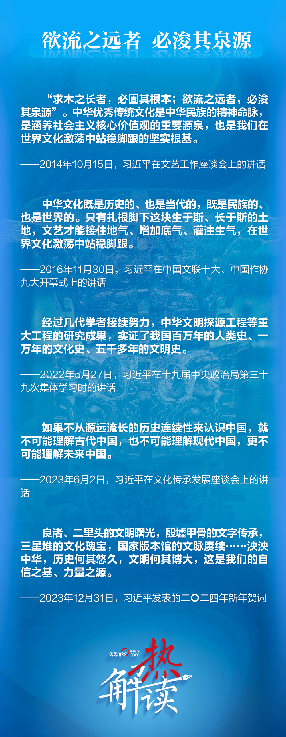 一件件文物、一處處文化古跡、一項(xiàng)項(xiàng)文化藝術(shù),串連起中華民族的文化史,蘊(yùn)藏著“何以中國(guó)”的文化力量??倳?shū)記對(duì)中華文明之源的關(guān)注,彰顯的正是他對(duì)推動(dòng)文化繁榮、建設(shè)文化強(qiáng)國(guó)的深刻思考和文化自信。