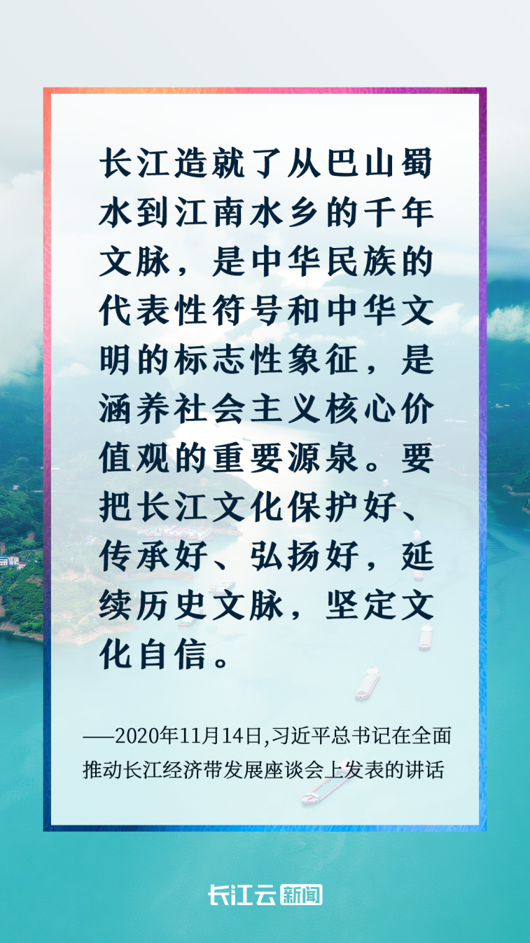 長江之水萬古奔流,千年文脈生生不息。黨的十八大以來,習近平總書記高度重視長江文化保護傳承弘揚,先后發(fā)表一系列重要講話,作出一系列重要指示批示,強調(diào)“要把長江文化保護好、傳承好、弘揚好,延續(xù)歷史文脈,堅定文化自信”。
