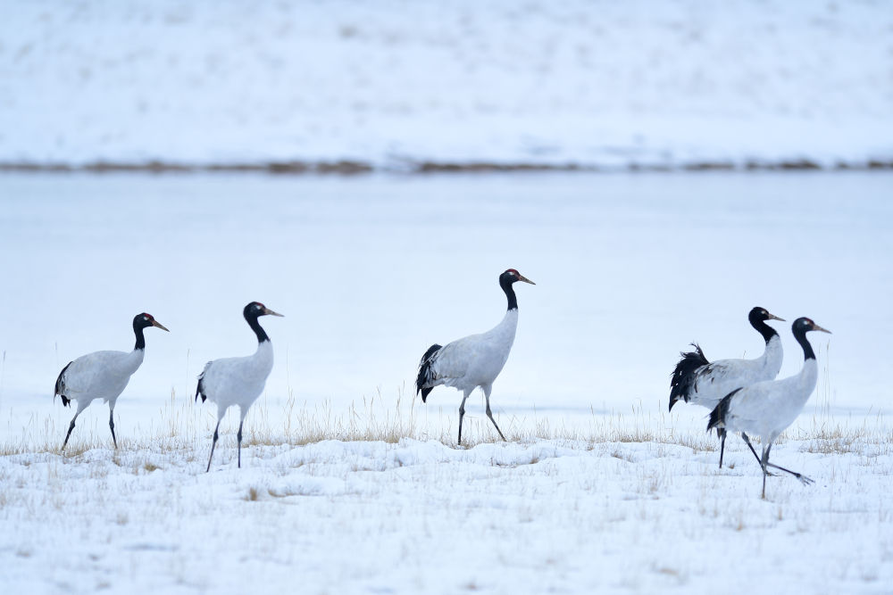 在三江源國家公園黃河源園區(qū)漫步的黑頸鶴。新華社記者 張龍 攝