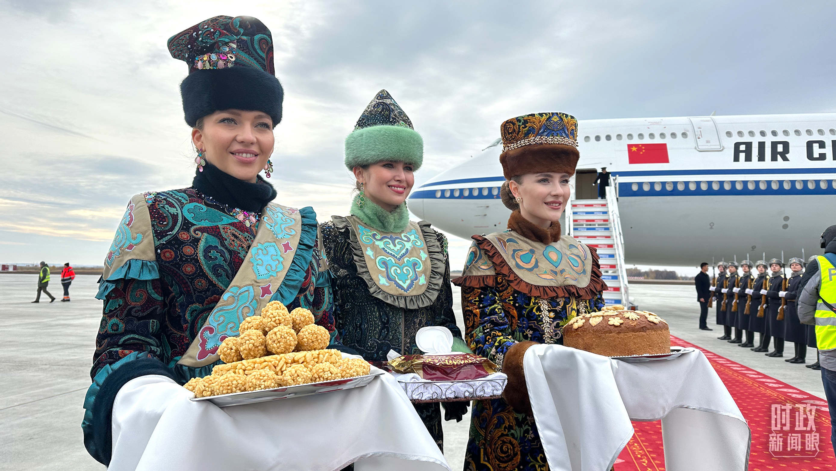 習(xí)主席專機(jī)抵達(dá)喀山國(guó)際機(jī)場(chǎng)時(shí),禮兵在紅毯兩側(cè)列隊(duì)致敬,身著民族服裝的俄羅斯女青年用傳統(tǒng)禮節(jié)表示歡迎。(總臺(tái)央視記者盧心雨拍攝)