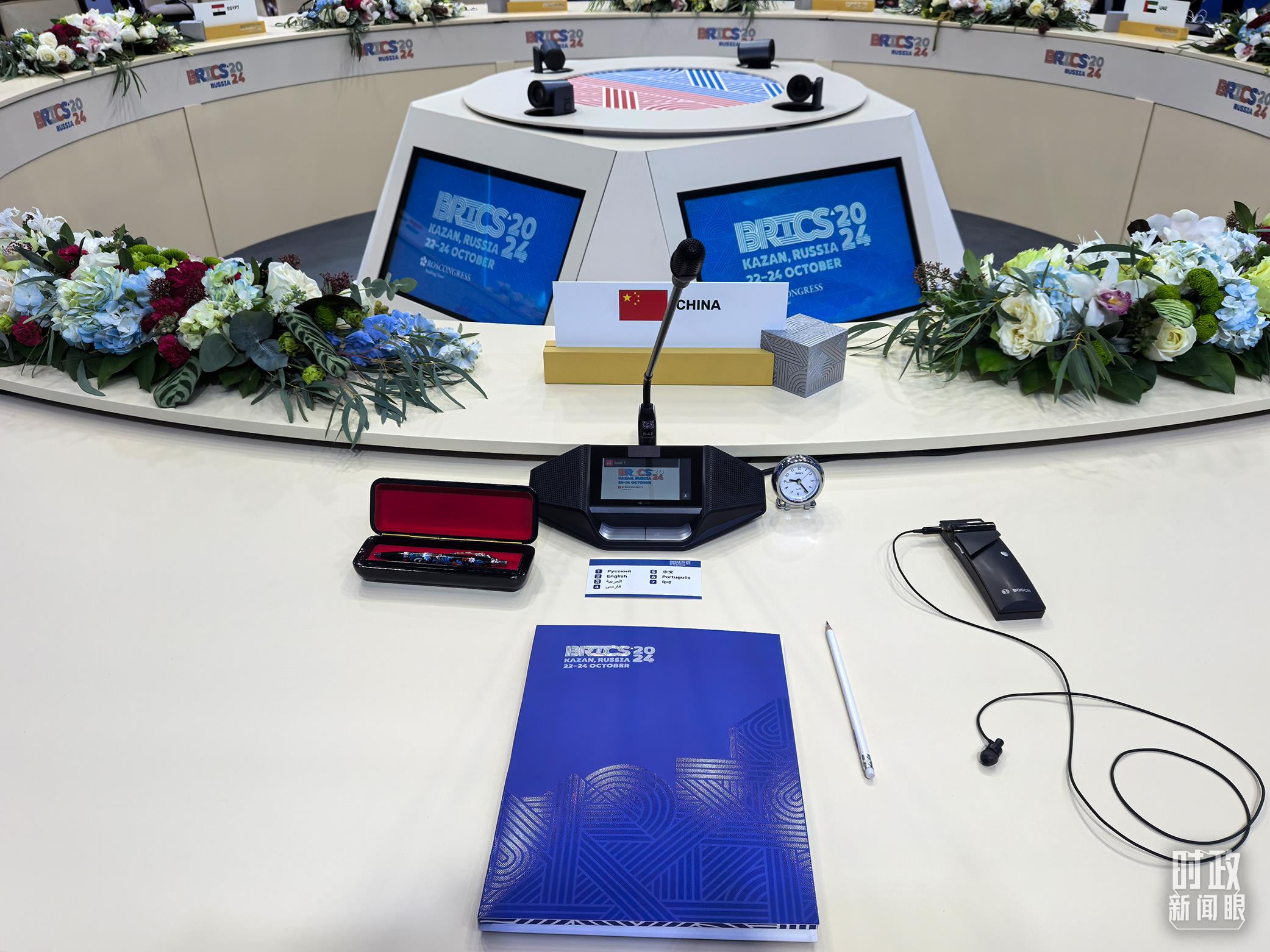 金磚國(guó)家領(lǐng)導(dǎo)人小范圍會(huì)議現(xiàn)場(chǎng)的會(huì)議桌。(總臺(tái)央視記者程鋮拍攝)
