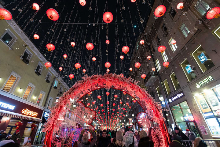 這是2024年2月9日在俄羅斯首都莫斯科拍攝的掛滿中國(guó)新年主題裝飾的街道。新華社記者 白雪騏 攝