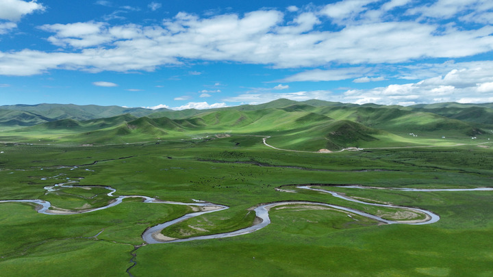 這是2023年7月6日拍攝的甘肅省甘南藏族自治州瑪曲縣阿萬倉濕地景色(無人機(jī)照片)?,斍h是黃河上游重要的水源涵養(yǎng)區(qū)和生態(tài)功能區(qū),被稱為“黃河之腎”。多年來,甘肅省實(shí)施退牧還草、退化草原生態(tài)修復(fù)等治理工程,草原生態(tài)環(huán)境明顯改善。