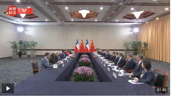 當?shù)貢r間11月15日,國家主席習近平在利馬出席亞太經(jīng)合組織領導人非正式會議期間會見智利總統(tǒng)博里奇。