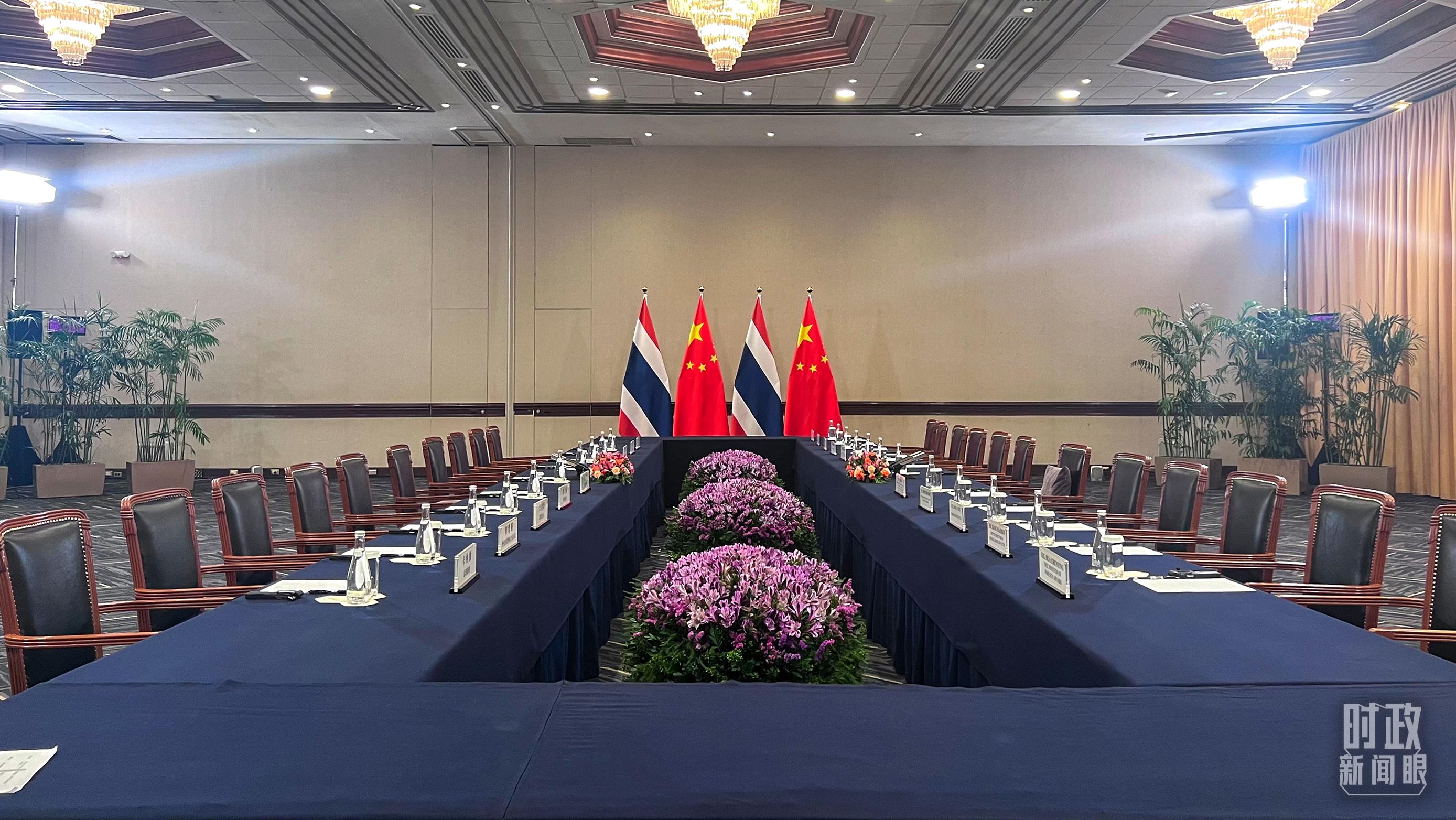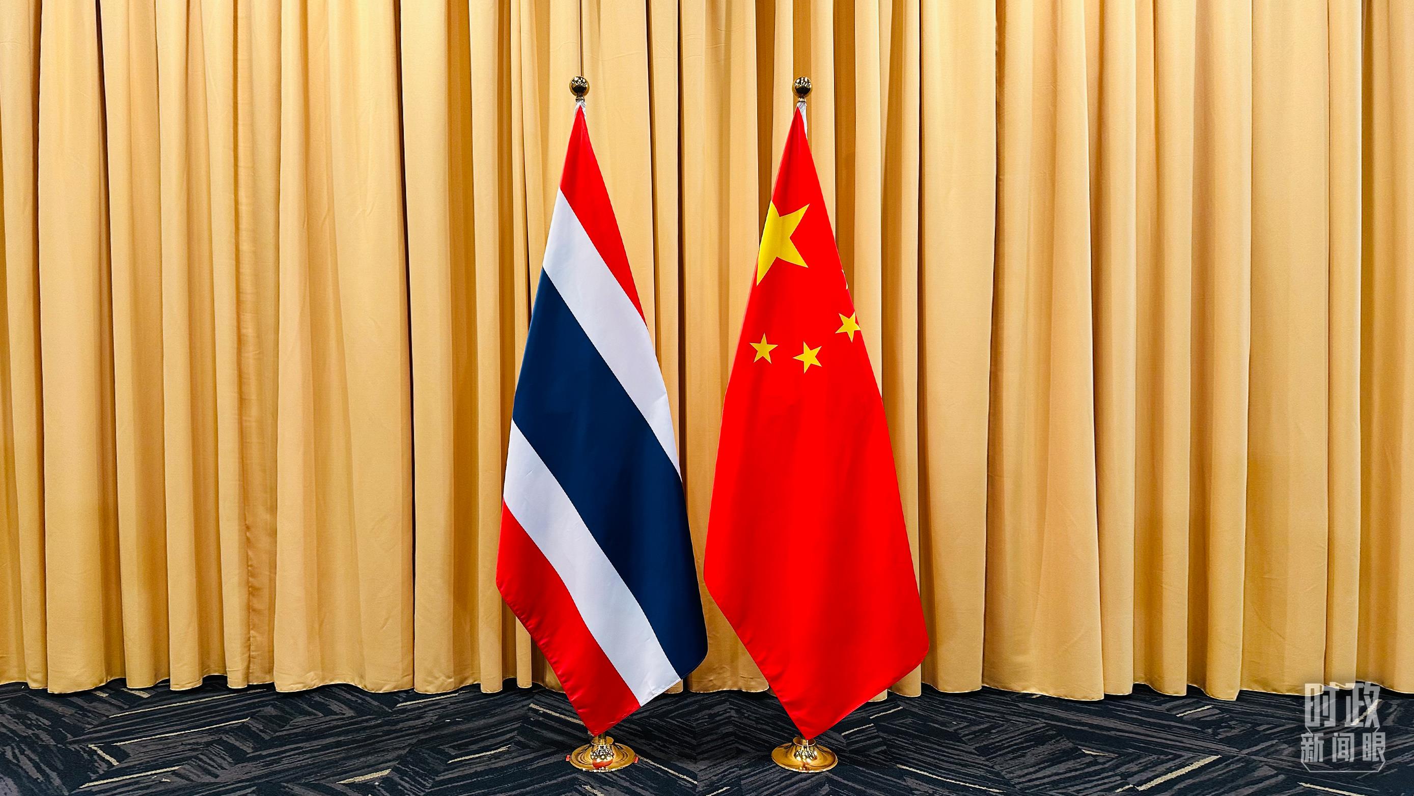 會見現(xiàn)場的中泰兩國國旗。(總臺央視記者范一鳴拍攝)