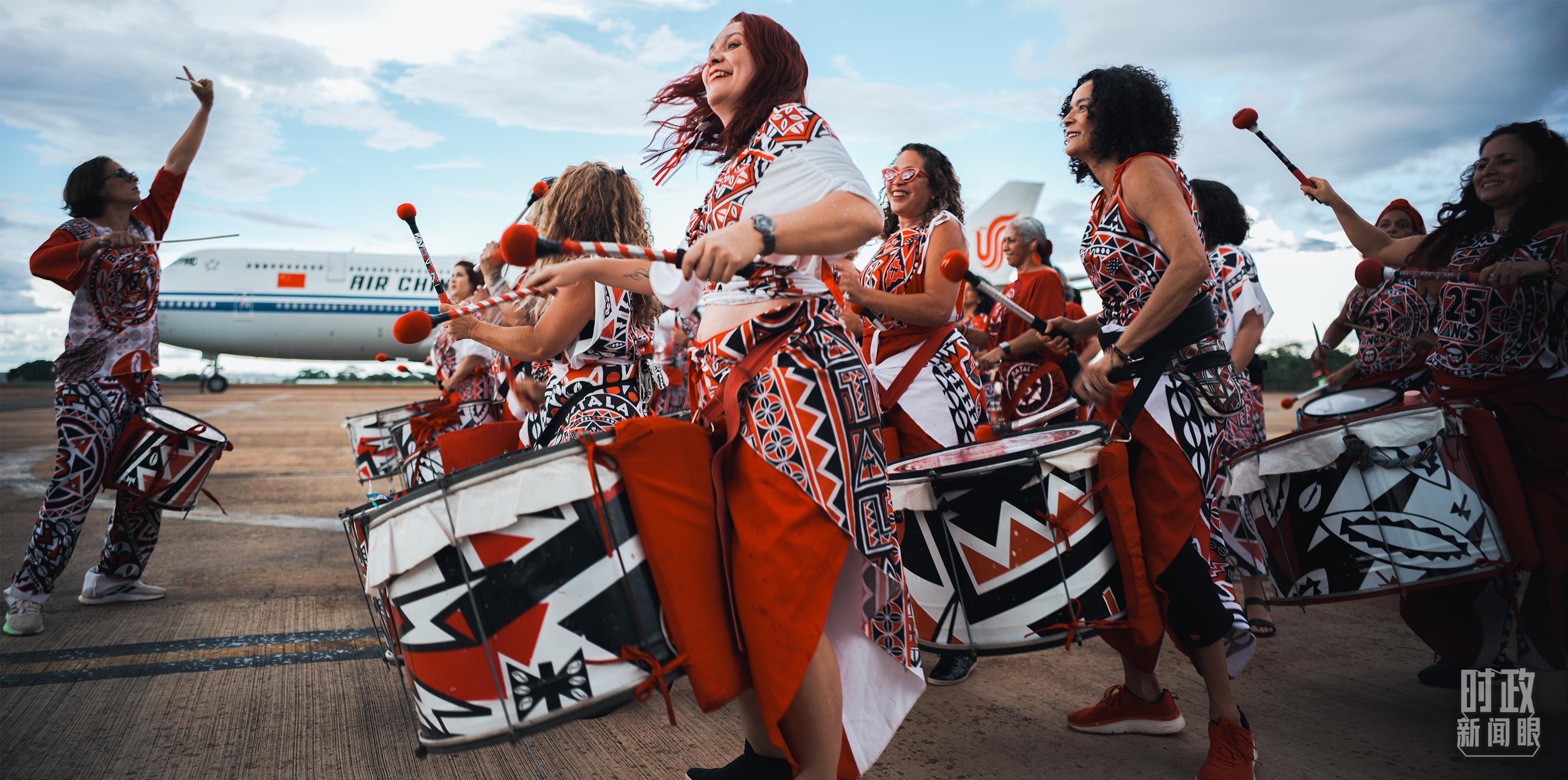 習(xí)主席乘專機(jī)抵達(dá)巴西利亞,藝術(shù)家演奏特色鼓樂。(總臺(tái)央視記者彭漢明拍攝)