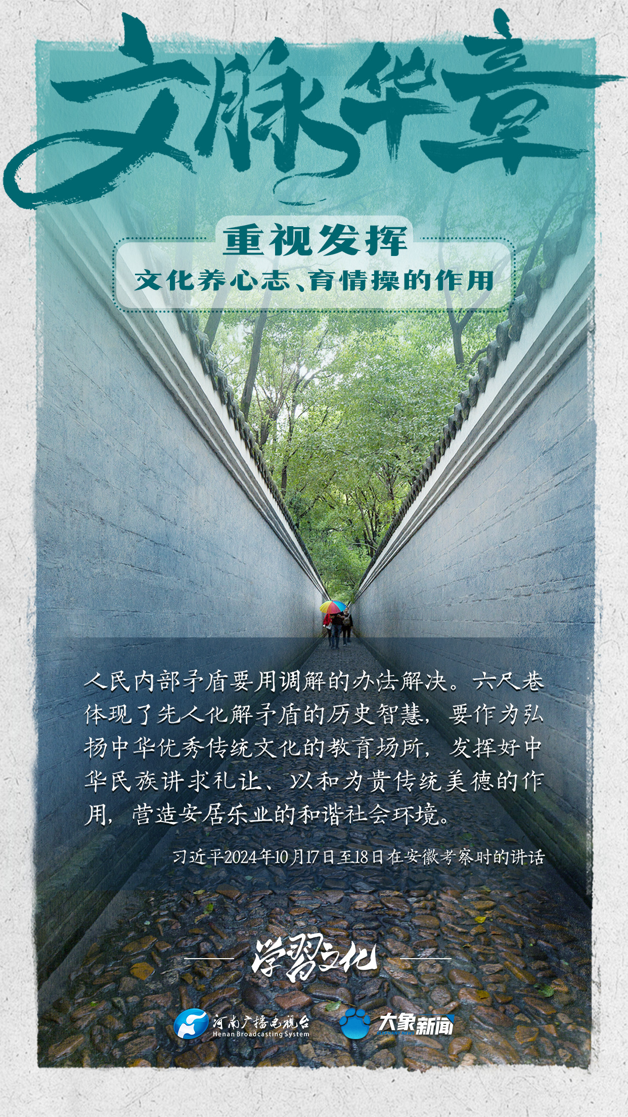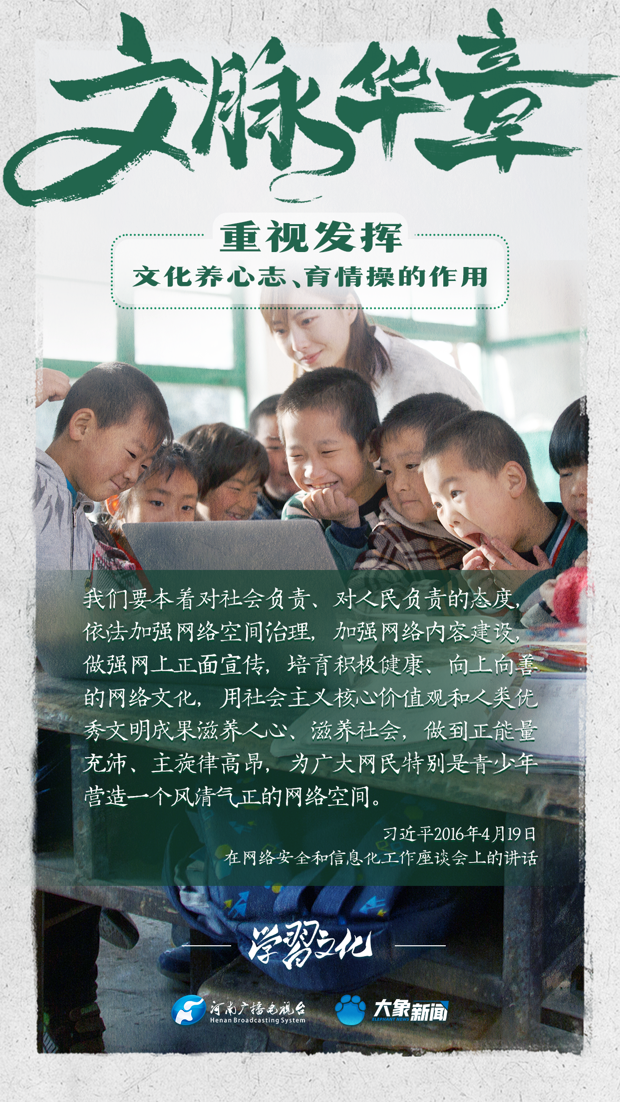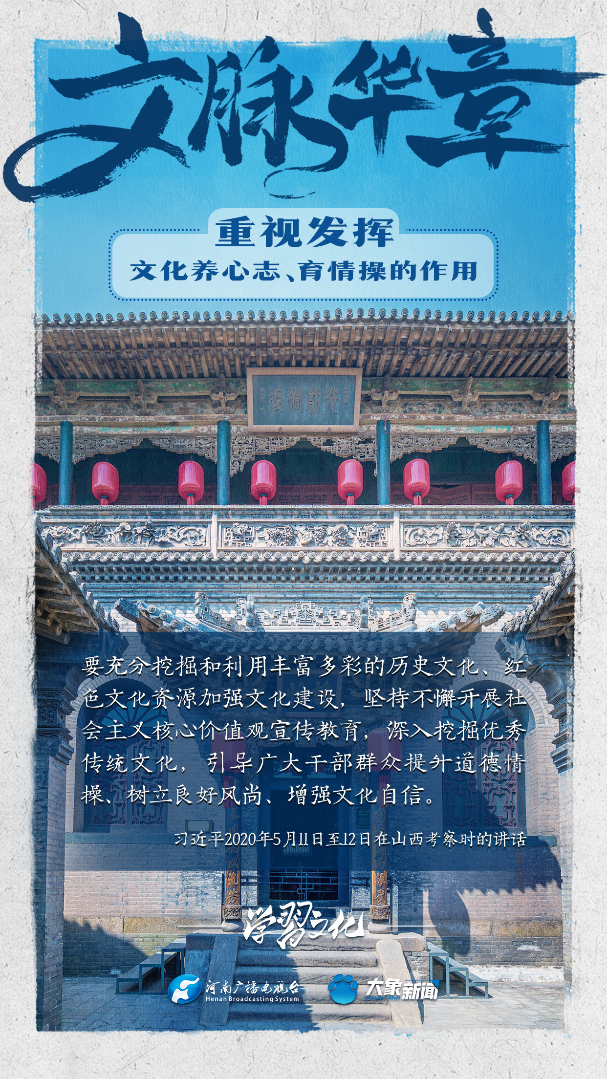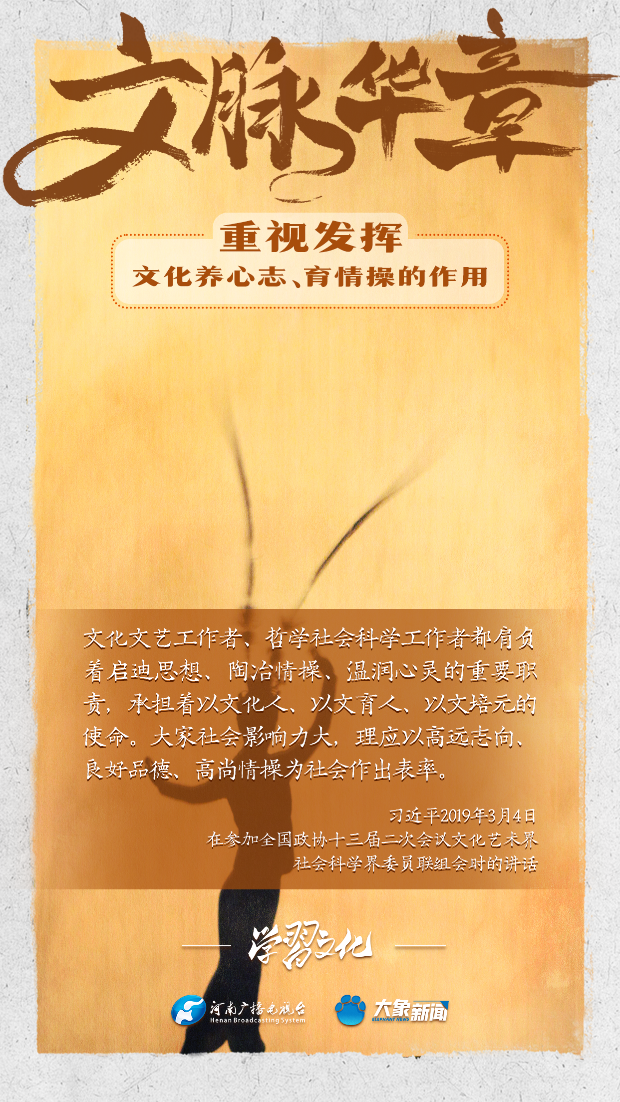 習(xí)近平總書記在主持中共中央政治局第十七次集體學(xué)習(xí)時強調(diào),重視發(fā)揮文化養(yǎng)心志、育情操的作用,涵養(yǎng)全民族昂揚奮發(fā)的精神氣質(zhì)??倳浉叨戎匾曃幕淖饔?,發(fā)表了一系列重要講話,倡導(dǎo)以文載道、以文傳聲、以文化人。我們一起學(xué)習(xí)。