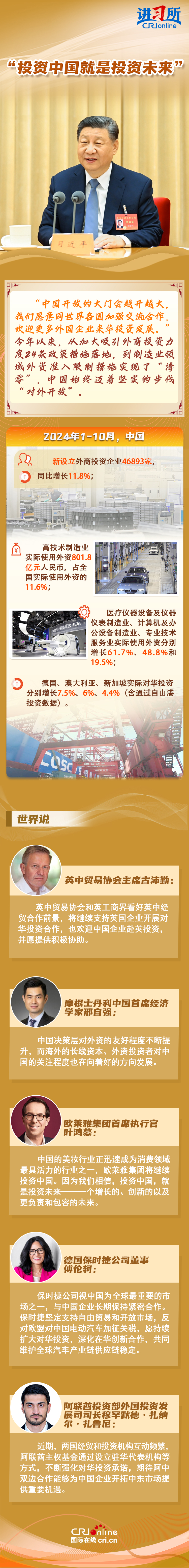 “中國是實(shí)干家、行動(dòng)派?!苯衲暌詠?,從習(xí)近平主席的歐洲之行到拉美之行,再到四天前在北京會(huì)見主要國際經(jīng)濟(jì)組織負(fù)責(zé)人,習(xí)近平一直強(qiáng)調(diào),中國的發(fā)展將給世界帶來巨大機(jī)遇。據(jù)聯(lián)合國貿(mào)易和發(fā)展會(huì)議不久前發(fā)布的《世界投資報(bào)告2024》中文版顯示,中國吸引外資的結(jié)構(gòu)不斷優(yōu)化、質(zhì)量不斷提高,多位政商界人士也認(rèn)為中國是一個(gè)非常有前景的市場,投資中國就是投資未來。