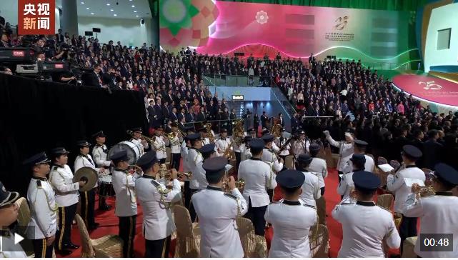 慶祝澳門回歸祖國25周年大會暨澳門特別行政區(qū)第六屆政府就職典禮20日上午在澳門東亞運動會體育館隆重舉行,現(xiàn)場全體起立,奏唱國歌。