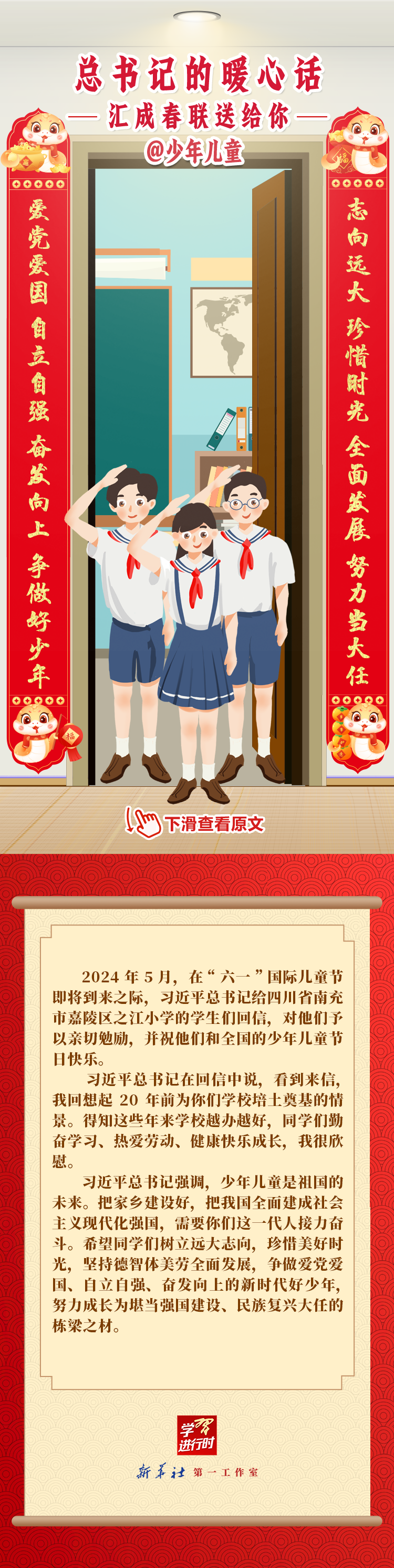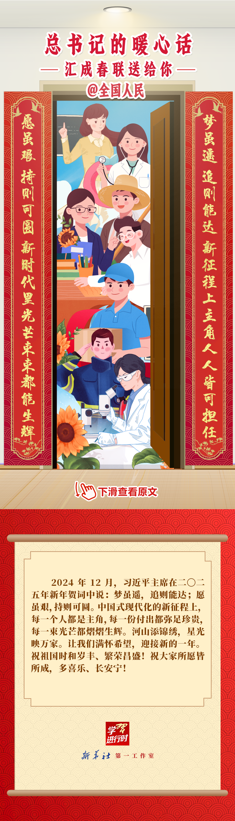 【學(xué)習(xí)進(jìn)行時(shí)】過(guò)春節(jié),貼春聯(lián),寄托人們對(duì)新年的美好愿望。過(guò)去一年,習(xí)近平總書(shū)記在不同場(chǎng)合點(diǎn)贊各行各業(yè)奮斗者,說(shuō)了許多暖心話。新春之際,我們匯編成聯(lián),向新征程上的每一位“主角”致敬,送上新春的祝福。