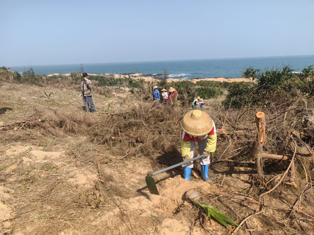 “和原來的木麻黃樹相比,椰子樹不僅抗風能力更強,也更加美觀。”工人韓吉衍嫻熟地將一鍬紅土鏟到剛種下的椰苗根部,并輕輕拍打夯實,“這一片椰林要種280畝,我們每天干八九個小時,這幾天就要種完?!?/p>