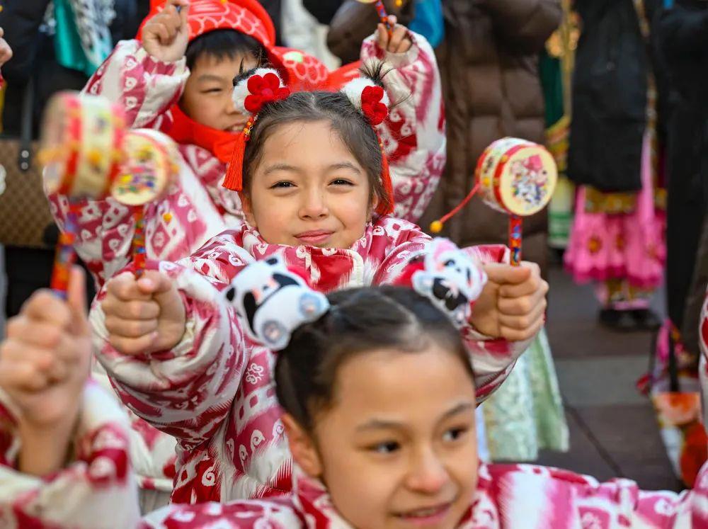 新疆大巴扎社火迎新春,孩子們?cè)诂F(xiàn)場(chǎng)表演。