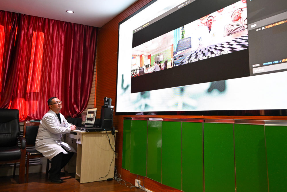 2024年12月17日,在青海省海南藏族自治州共和縣中醫(yī)院,醫(yī)生與鄉(xiāng)鎮(zhèn)衛(wèi)生院連線進行遠程會診。