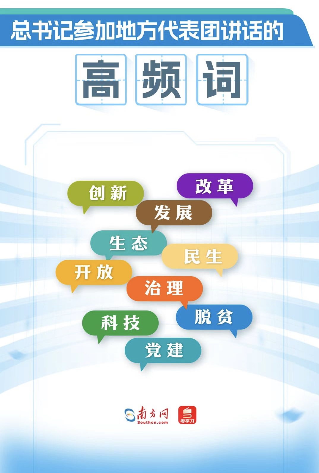 13年36次參加地方代表團(tuán)審議,習(xí)近平總書記的講話里,有哪些高頻詞?從詞云圖中,“創(chuàng)新”“改革”“發(fā)展”“生態(tài)”“民生”“開放”“治理”“脫貧”“科技”“黨建”等詞語引人注目,反映了總書記的關(guān)注點(diǎn)。