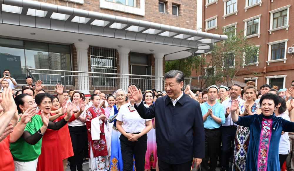 2022年7月13日上午,習(xí)近平在新疆烏魯木齊市天山區(qū)固原巷社區(qū)考察時(shí),身著民族服裝的各族群眾簇?fù)碓诳倳浬磉?,載歌載舞,向總書記表達(dá)由衷的愛戴。