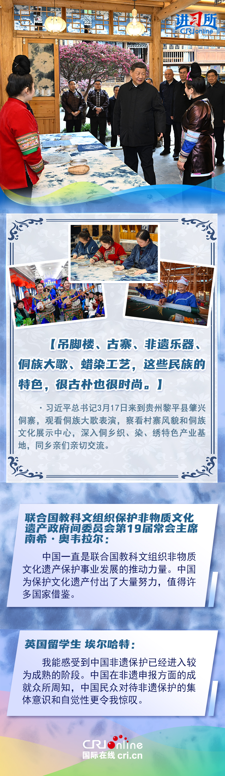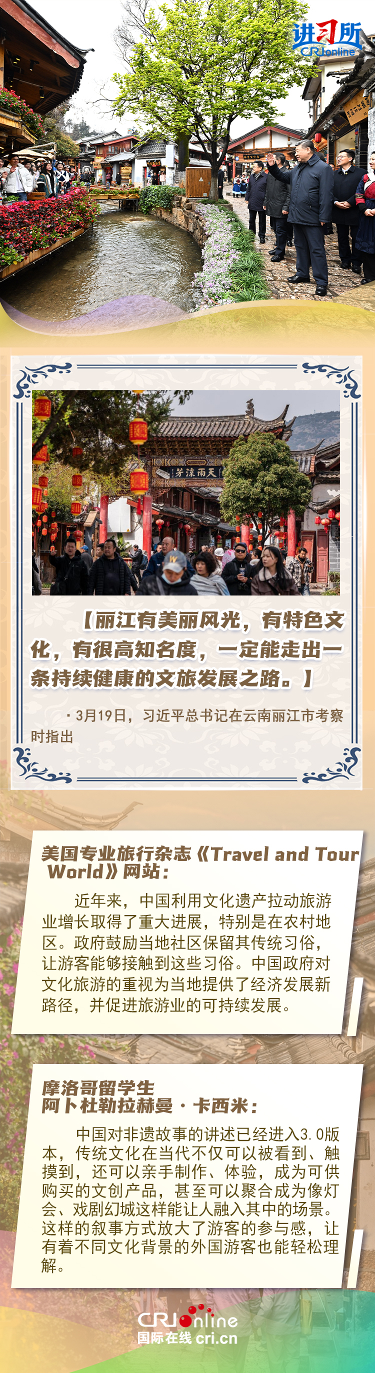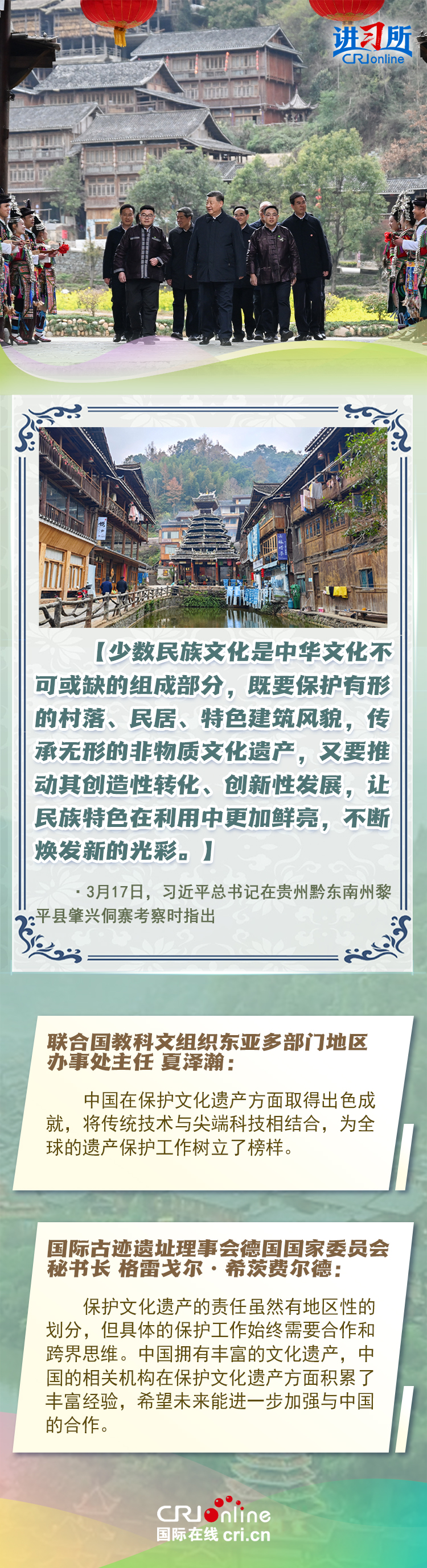 習近平總書記近日赴貴州、云南考察。他走進民族特色村寨、歷史文化古城,心系歷史文化遺產保護和文旅融合發(fā)展。習近平特別叮囑當?shù)毓賳T和群眾,既要保護有形的村落、民居、特色建筑風貌,傳承無形的非物質文化遺產,又要推動其創(chuàng)造性轉化、創(chuàng)新性發(fā)展。