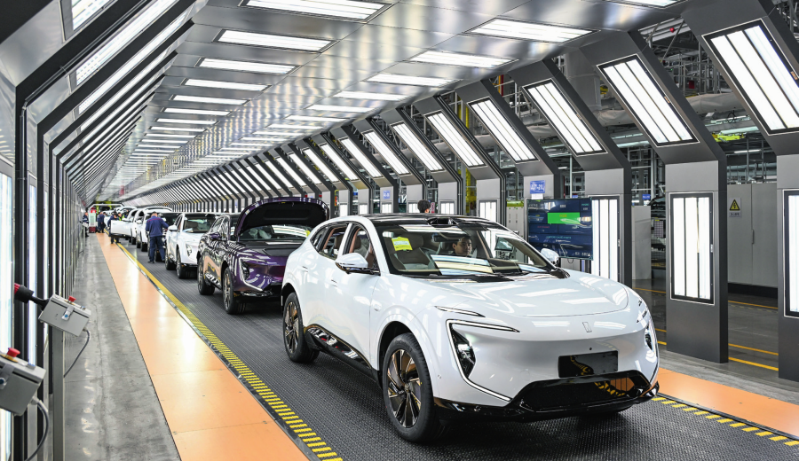 位于重慶市渝北區(qū)的長(zhǎng)安汽車(chē)數(shù)智工廠總裝車(chē)間拍攝的即將下線(xiàn)的新能源汽車(chē)(2025 年 3 月 6 日攝) 王全超攝 / 本刊