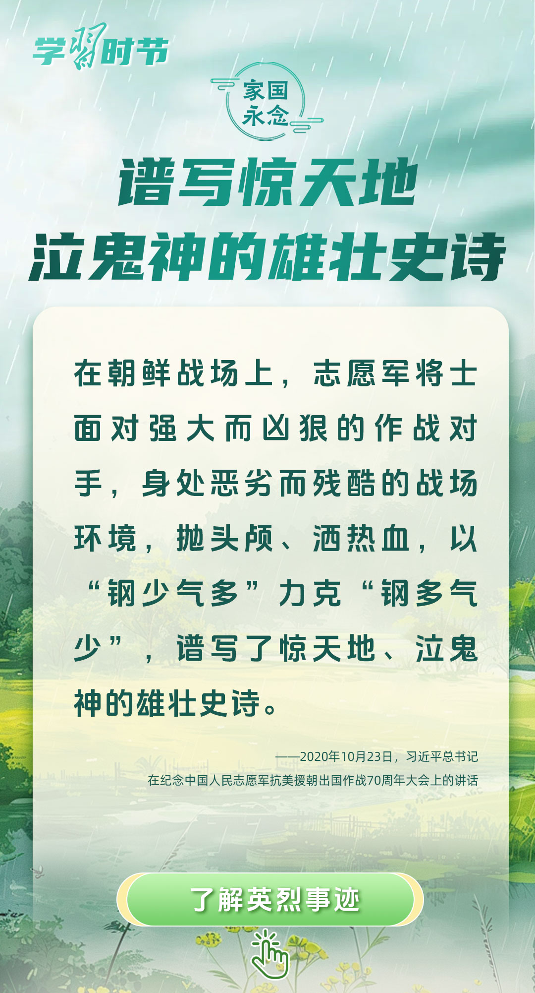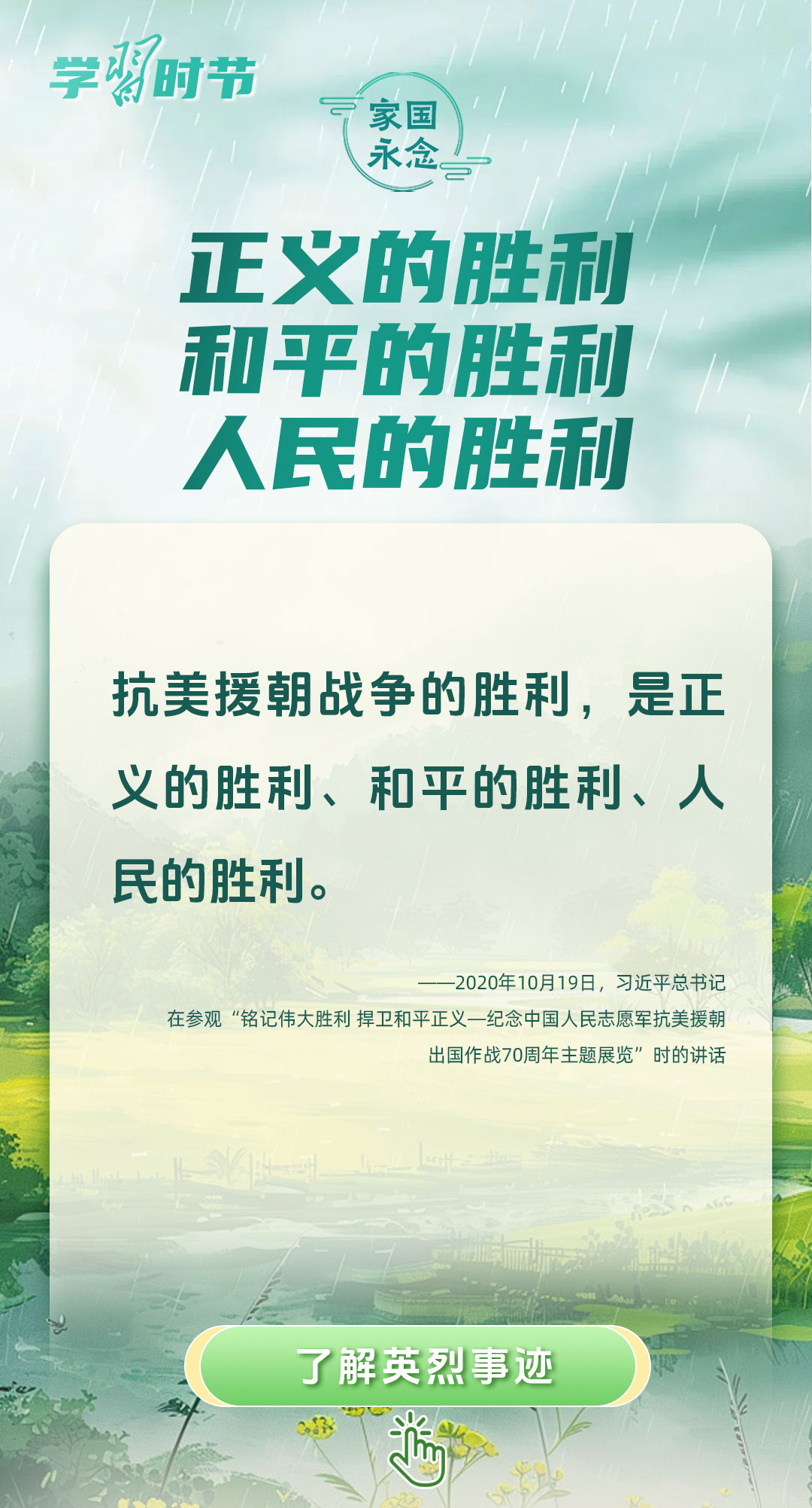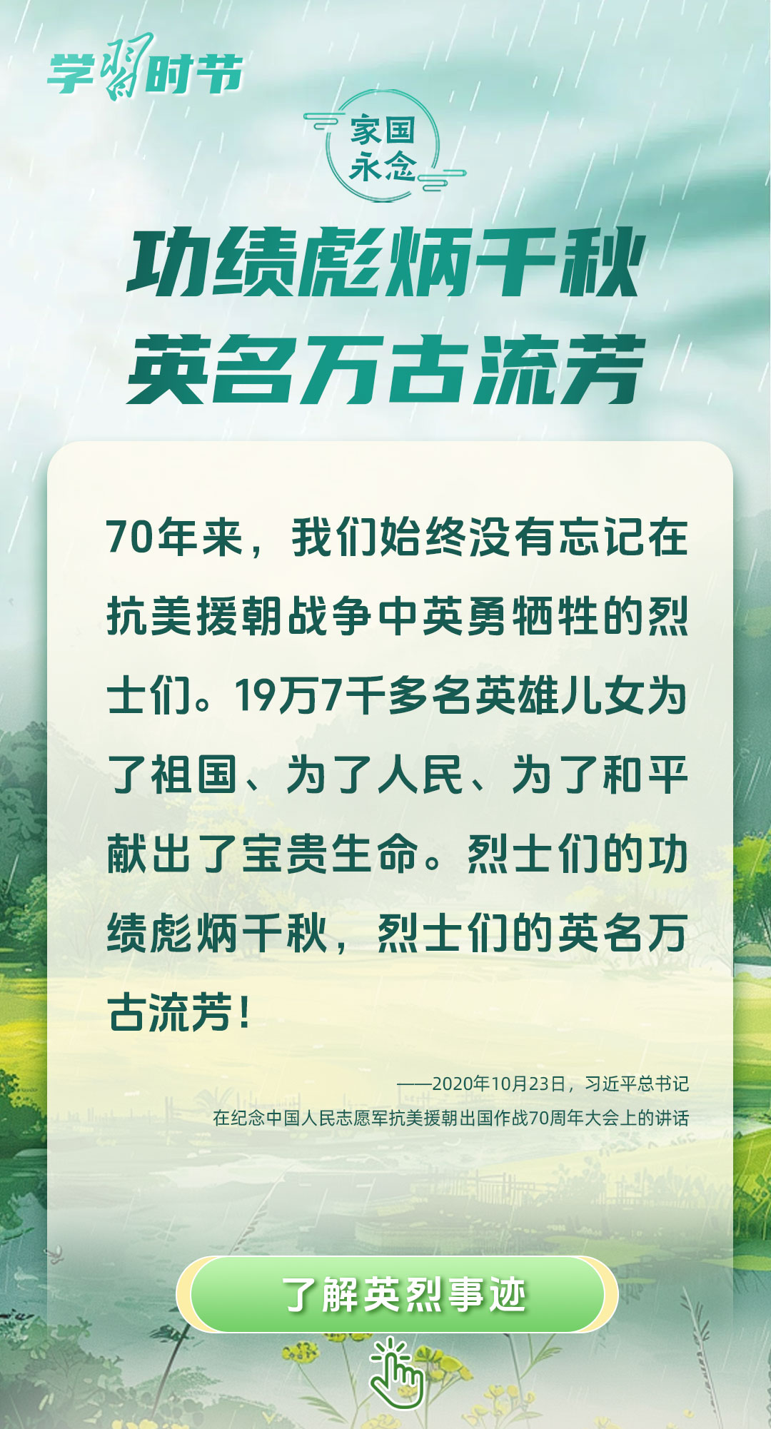 今年是中國人民抗日戰(zhàn)爭暨世界反法西斯戰(zhàn)爭勝利80周年、中國人民志愿軍抗美援朝出國作戰(zhàn)75周年。習近平總書記曾說:“對一切為國家、為民族、為和平付出寶貴生命的人們,不管時代怎樣變化,我們都要永遠銘記他們的犧牲和奉獻。”今天我們所擁有的一切,無不凝結著英雄、英烈們的奉獻付出乃至巨大犧牲。