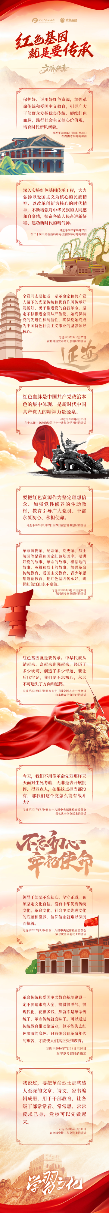 習近平總書記高度重視紅色基因傳承,發(fā)表了一系列重要講話,引導我們賡續(xù)紅色血脈,激發(fā)愛國熱情,振奮民族精神。我們一起學習。