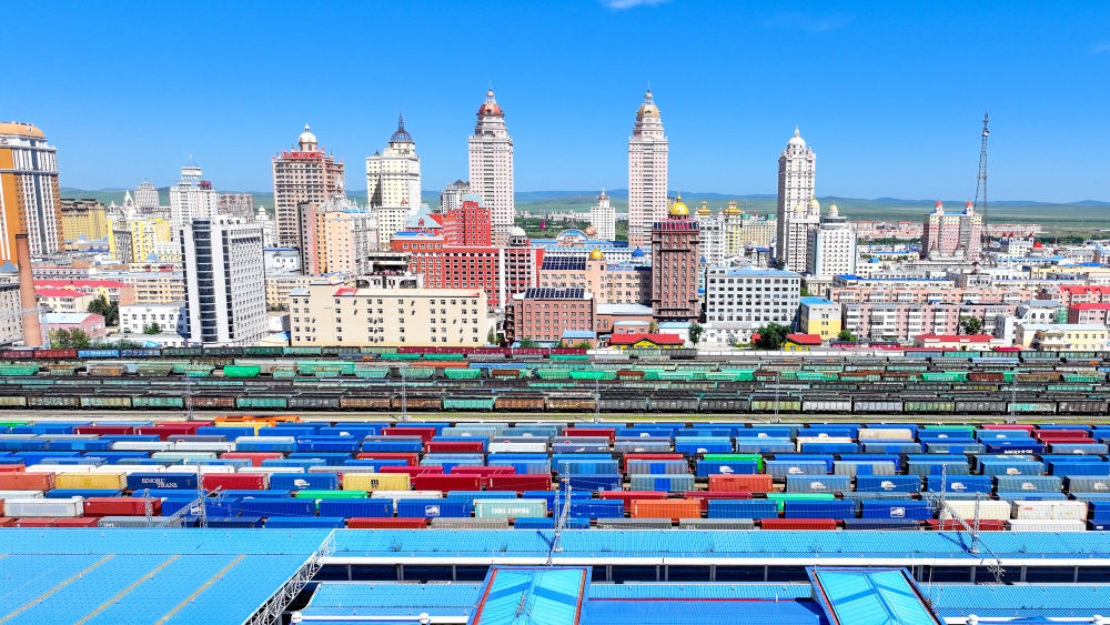 2024年8月20日,中歐班列在內(nèi)蒙古滿洲里口岸準(zhǔn)備出境(無(wú)人機(jī)照片)。滿洲里口岸位于中俄蒙三國(guó)交界處,是中國(guó)最大的陸路口岸,也是連接俄羅斯、蒙古國(guó)的重要樞紐。2024年,滿洲里口岸中歐班列通行量突破4000列,為推進(jìn)高質(zhì)量共建“一帶一路”注入新動(dòng)能。