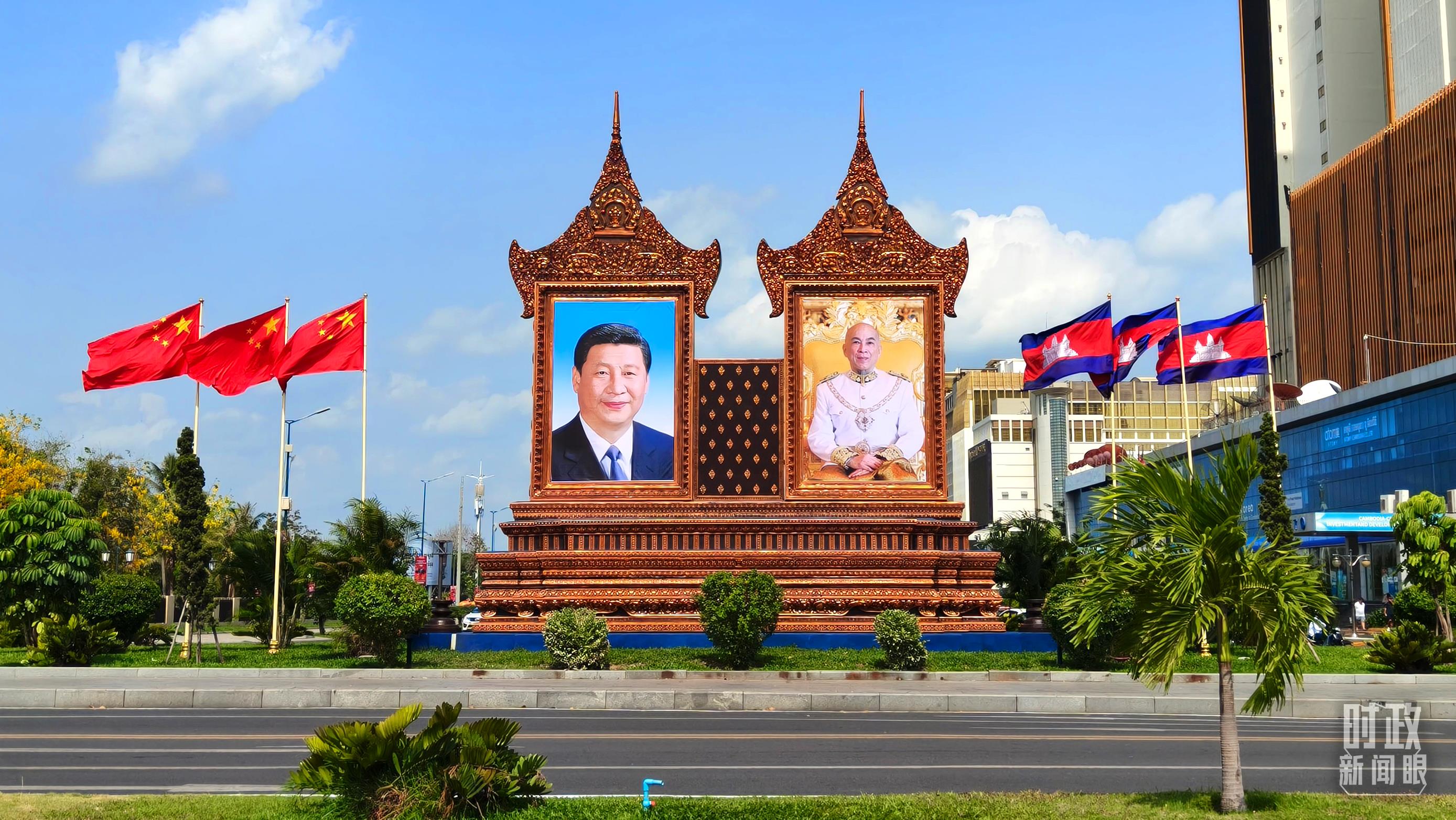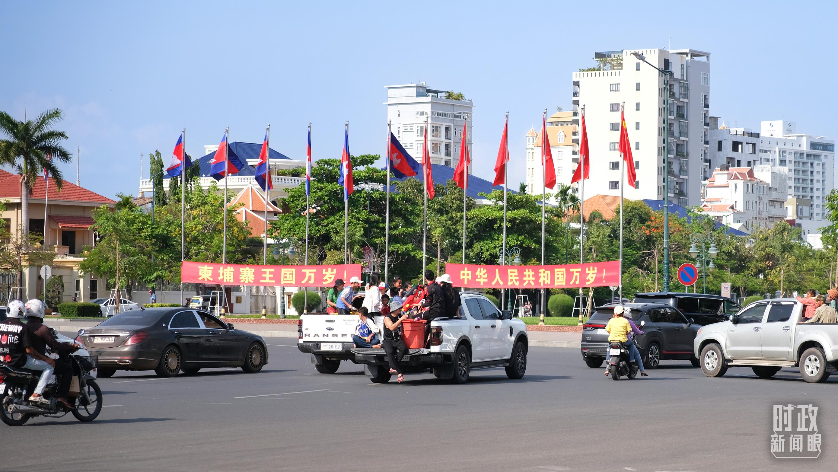 金邊街頭的巨幅兩國領(lǐng)導(dǎo)人照片和兩國國旗。(總臺央視記者陸泓宇拍攝)