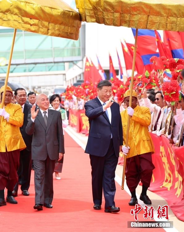 當(dāng)?shù)貢r(shí)間4月17日上午,中國(guó)國(guó)家主席習(xí)近平乘專(zhuān)機(jī)抵達(dá)金邊,應(yīng)柬埔寨國(guó)王西哈莫尼邀請(qǐng),對(duì)柬埔寨進(jìn)行國(guó)事訪問(wèn)。西哈莫尼在機(jī)場(chǎng)為習(xí)近平舉行隆重歡迎儀式。 中新社記者 盛佳鵬 攝