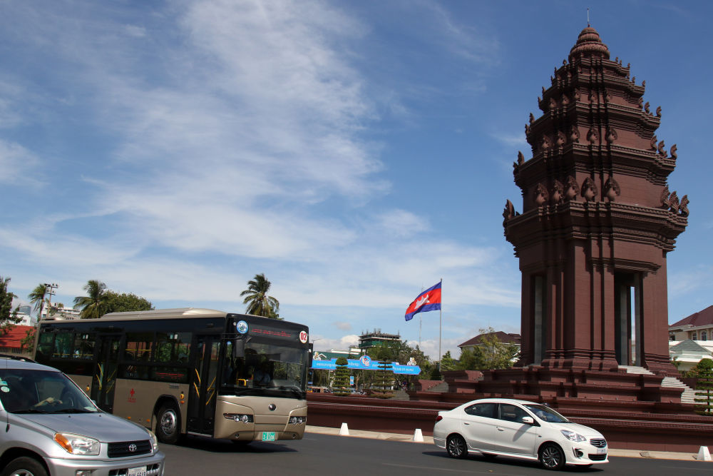 2018年1月5日,在柬埔寨金邊,一輛中國援助的“宇通”公交車經(jīng)過獨立紀念碑。