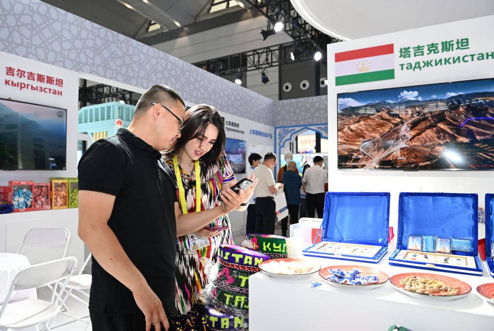 2025年5月21日,在第九屆絲綢之路國際博覽會(huì)暨中國東西部合作與投資貿(mào)易洽談會(huì)絲路優(yōu)品展上,參觀者了解塔吉克斯坦商品。新華社記者 李一博 攝