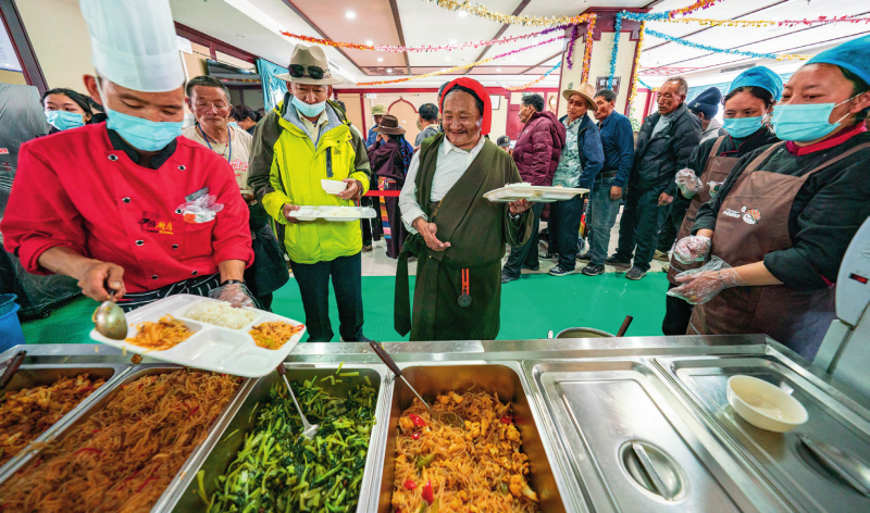 在西藏那曲市色尼區(qū)老年人日間照料中心,老人們在排隊(duì)打飯(2025年4月25日攝)丁增尼達(dá)攝/本刊