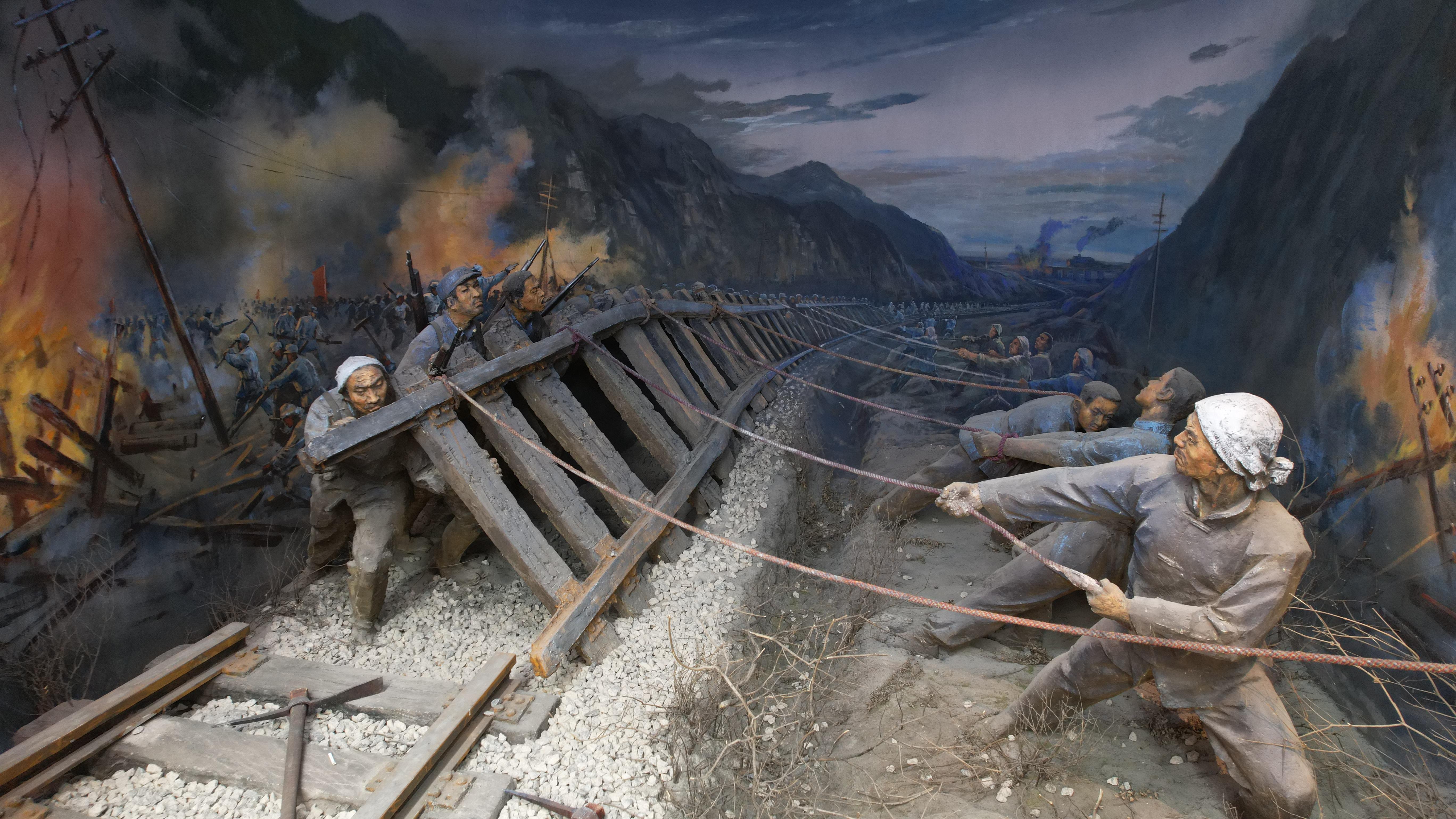 △百團大戰(zhàn)紀(jì)念館內(nèi)展示的軍民掀翻鐵軌的場景。(總臺央視記者范凱、裴大偉拍攝)