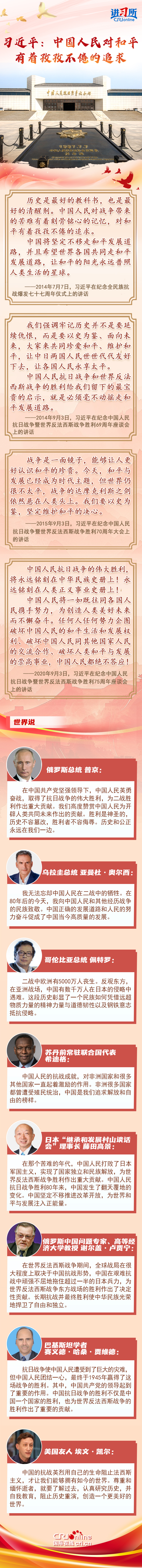 “中國人民抗日戰(zhàn)爭和世界反法西斯戰(zhàn)爭的勝利給我們留下的最寶貴的啟示,就是必須毫不動搖走和平發(fā)展道路?!弊鳛槭澜缟衔ㄒ粚⒑推桨l(fā)展寫入憲法和執(zhí)政黨黨章、上升為國家意志的大國,中國始終從歷史中汲取智慧和力量,堅定捍衛(wèi)來之不易的勝利成果。在國際友好人士眼中,中國為世界反法西斯戰(zhàn)爭東方戰(zhàn)場的勝利作出了決定性貢獻(xiàn),中國正確的發(fā)展道路和人民的努力奮斗促成了中國當(dāng)今高質(zhì)量的發(fā)展,為世界和平與發(fā)展注入正能量。