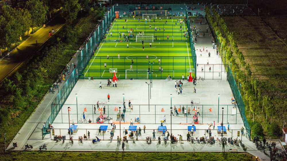 2024年9月21日,居民在山東省寧陽縣城區(qū)一處體育公園內(nèi)運(yùn)動(無人機(jī)照片)。近年來,寧陽縣充分利用城市空閑區(qū)域,新建或改建體育健身公園,為居民打造“10分鐘體育健身圈”,讓城市的“金角銀邊”成為全民健身大舞臺。