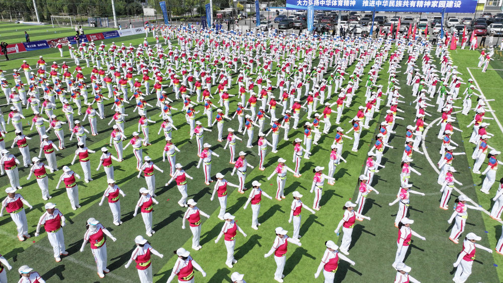 2025年6月10日,群眾在寧夏銀川市金鳳區(qū)覽山公園參加千人健身操展演(無人機(jī)照片)。當(dāng)日,紀(jì)念“發(fā)展體育運(yùn)動 增強(qiáng)人民體質(zhì)”題詞73周年全民健身主題活動在覽山公園舉行