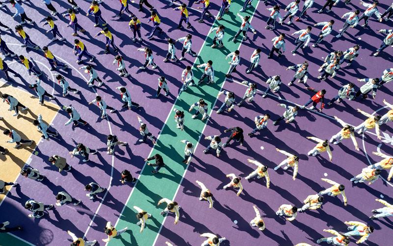 △2025年2月28日,云南昆明金康園小學(xué)學(xué)生在操場(chǎng)上做課間操。