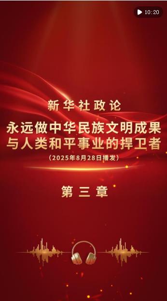 新華社8月28日播發(fā)《新華社政論|永遠(yuǎn)做中華民族文明成果與人類(lèi)和平事業(yè)的捍衛(wèi)者——寫(xiě)在中國(guó)人民抗日戰(zhàn)爭(zhēng)暨世界反法西斯戰(zhàn)爭(zhēng)勝利80周年之際》。我們邀請(qǐng)誦讀嘉賓吳樾演播“第三章”。