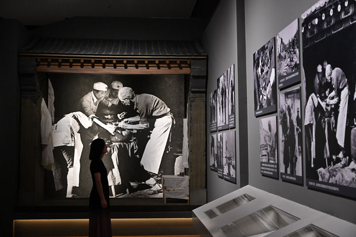 2025年9月7日,在中國國家博物館,一名媒體人員觀看白求恩的照片。