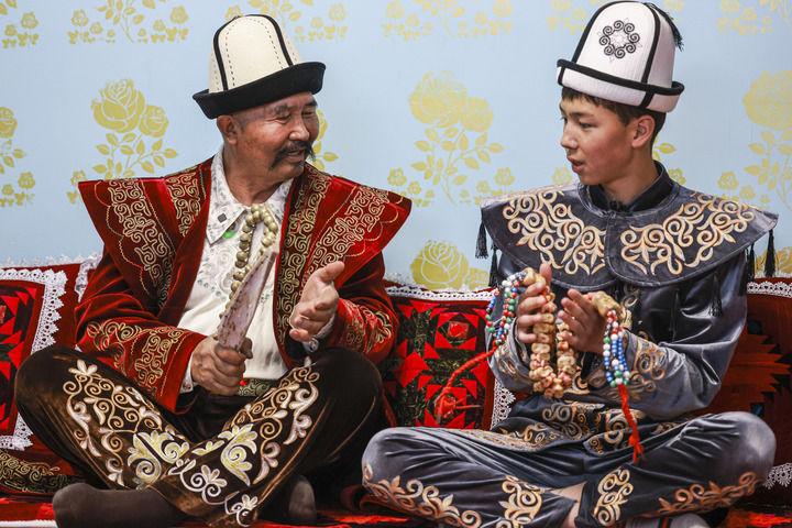《瑪納斯》國家級(jí)非物質(zhì)文化遺產(chǎn)代表性傳承人江努日·圖日干巴依(左)教徒弟演唱《瑪納斯》(2025年4月21日攝)。新華社記者 王菲 攝