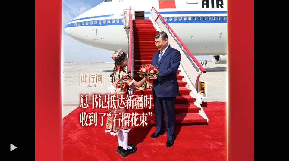 習(xí)近平率中央代表團(tuán)23日下午乘專機(jī)抵達(dá)烏魯木齊,出席新疆維吾爾自治區(qū)成立70周年慶?;顒?dòng),新疆各族群眾在機(jī)場(chǎng)熱烈歡迎??倳?shū)記收到的花束里,裝點(diǎn)了美麗的石榴。如今,“石榴籽”的妙喻為人熟知,民族團(tuán)結(jié)觀念深入人心。