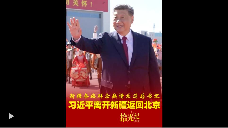 25日,習(xí)近平乘專(zhuān)機(jī)返回北京。烏魯木齊天山機(jī)場(chǎng)奏響別具特色的樂(lè)曲《我們?cè)谝黄稹?,各族群眾載歌載舞熱情歡送總書(shū)記。
