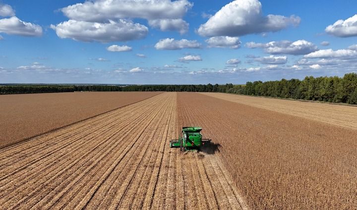 2025年9月19日,在北大荒集團黑龍江格球山農(nóng)場有限公司大豆地塊,收獲機車在進行收獲作業(yè)(無人機照片)。新華社發(fā)(陸文祥攝)