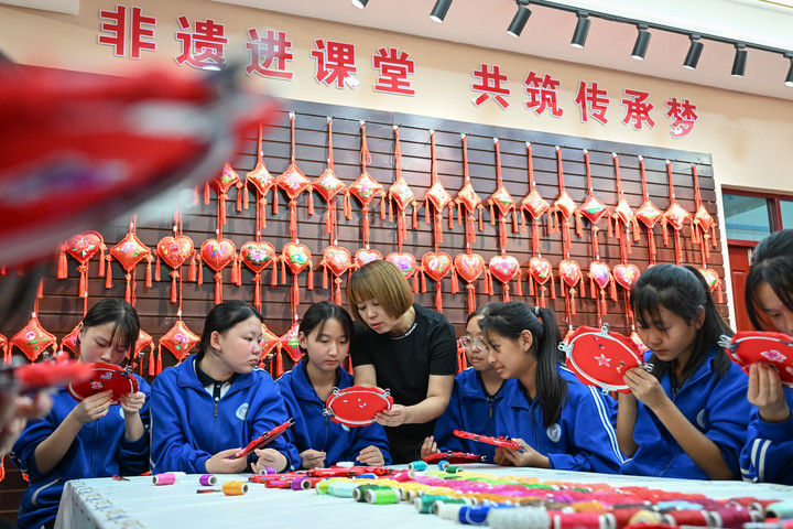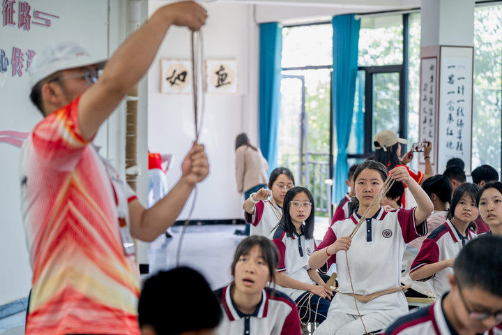 2025年9月26日,內(nèi)蒙古興安盟科右中旗巴彥呼舒第六中學(xué)美術(shù)教師、非遺代表性傳承人吳斯琴(左四)指導(dǎo)學(xué)生刺繡。近年來,內(nèi)蒙古興安盟科爾沁右翼中旗巴彥呼舒第六中學(xué)將當(dāng)?shù)貒壹壏沁z圖什業(yè)圖刺繡引入校園,開設(shè)校本課程,并成立興趣社團(tuán),在豐富校園文化生活的同時,讓學(xué)生們近距離感受非遺的魅力,弘揚(yáng)和傳承中華優(yōu)秀傳統(tǒng)文化。隨著國產(chǎn)動畫電影《哪吒之魔童鬧?!凡粩嗨⑿轮袊笆菲狈考o(jì)錄,參與電影配樂的貴州省榕江縣三寶侗寨的楊想妮和“舞樂蟬歌”團(tuán)隊為更多人所熟知。樂團(tuán)成員懷揣“用音樂傳遞侗族文化,讓世界聽見侗族大歌”的共同夢想,將侗族大歌推向更廣闊的舞臺。這是2025年4月22日,楊想妮在貴州省黎平縣肇興鎮(zhèn)廈格侗寨教前來研學(xué)的孩子們唱侗歌。