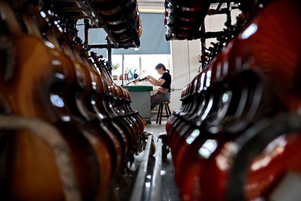 2025年5月28日,河北省武強縣一家樂器生產企業(yè)的工人在制作尤克里里。武強縣樂器產業(yè)歷經30余年的發(fā)展,形成擁有超過150家企業(yè)、從業(yè)人員萬余人的產業(yè)集群,產品覆蓋100多個品種、400多種規(guī)格。近年來,武強縣依托樂器文化產業(yè)資源,打造集樂器加工、樂器體驗、音樂展演和休閑度假等業(yè)態(tài)為一體的周窩音樂小鎮(zhèn),同時創(chuàng)新“樂器+”鄉(xiāng)村振興模式,持續(xù)增強樂器產業(yè)的富民強縣作用。2024年武強縣樂器產業(yè)實現(xiàn)營收23.8億元,旅游收入超10億元。