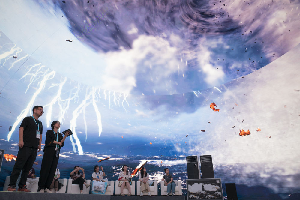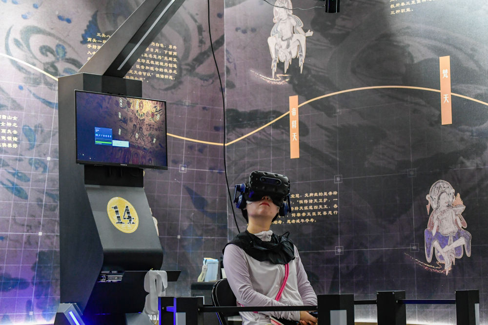 2024年7月22日,游客在“尋境敦煌——數(shù)字敦煌沉浸展”借助VR設備沉浸式游覽莫高窟第285窟虛擬場景。“尋境敦煌——數(shù)字敦煌沉浸展”綜合運用VR虛擬現(xiàn)實、三維建模、游戲引擎的物理渲染和全局動態(tài)光照等新技術,高精度立體還原了莫高窟第285窟。游客戴上VR眼鏡,不僅可以零距離觀賞壁畫、360度自由探索洞窟細節(jié),還能“飛升”到窟頂,身臨其境參與壁畫故事情節(jié),沉浸式感受敦煌文化的魅力。