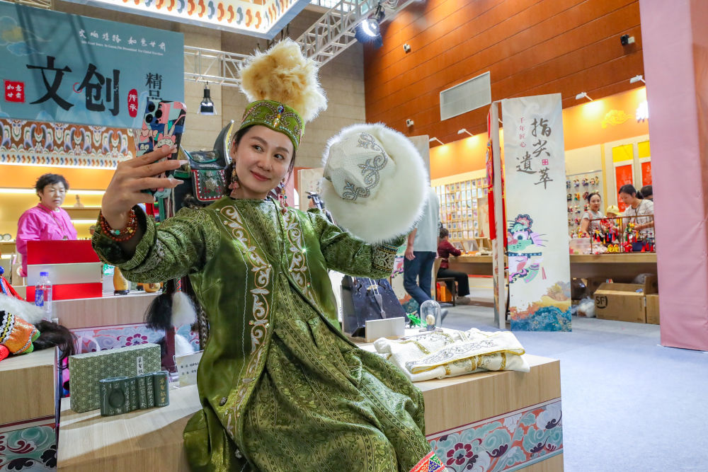 2025年9月22日,游客在敦煌文博會上身穿民族服飾自拍。9月20日至22日,第八屆絲綢之路(敦煌)國際文化博覽會在敦煌市舉行。敦煌研究院“典范”“高地”建設成果展、甘肅文旅非遺文創(chuàng)展、敦煌·絲路雕塑展等多項展覽同步亮相,集中展現(xiàn)了敦煌文化遺產保護、研究、弘揚的最新成果以及共建“一帶一路”國家的文化藝術、非遺文創(chuàng)、風土人情等精彩內容。