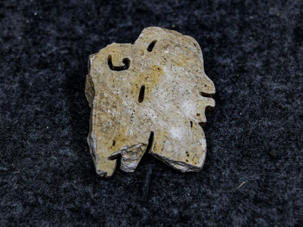 2024年7月10日在四川省文物考古研究院拍攝的三星堆遺址出土的玉石上陽刻的側(cè)身人像。三星堆遺址新發(fā)現(xiàn)與玉石器生產(chǎn)加工相關(guān)的遺存,專家初步判斷為玉石器“生產(chǎn)車間”,年代為商代中期,距今約3500年至3400年。