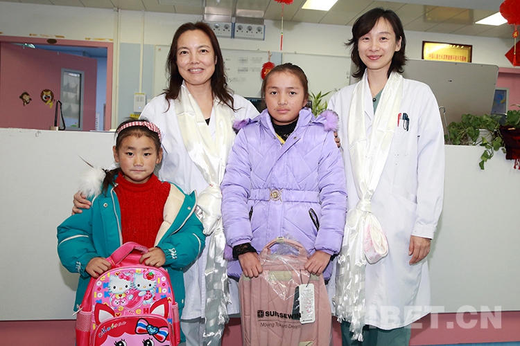 返鄉(xiāng)前,洛桑曲宗和次旦德吉在親屬和小學校長的帶領下來到兒研所,向醫(yī)護人員和共鑄中國心組委會的工作人員獻上了哈達和錦旗,表達感激之情。醫(yī)護人員也向兩個孩子贈送了書包等文具,鼓勵他們回校后好好學習。