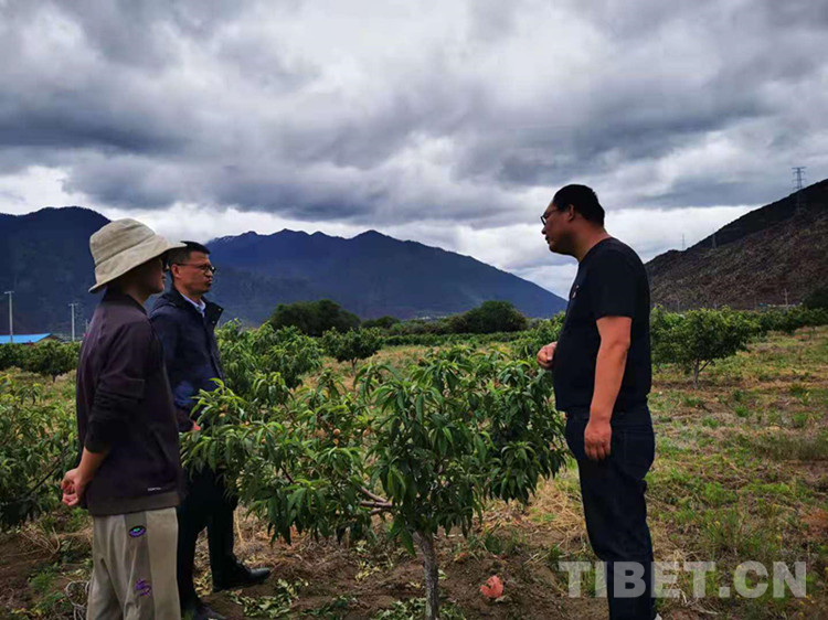 圖為李云海(右一)與工作人員一起探討桃樹栽種問題