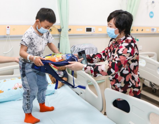 鄧莉副主任一行看望了來渝治療的15位患兒,并為他們送上嶄新的書包和文具。并與患兒家長熱情交談,詳細了解患兒恢復情況?;純杭覍俅碜楷敽屯贩謩e向重慶市衛(wèi)健委和重醫(yī)附屬兒童醫(yī)院贈送了錦旗,并獻上了潔白的哈達表示感謝。