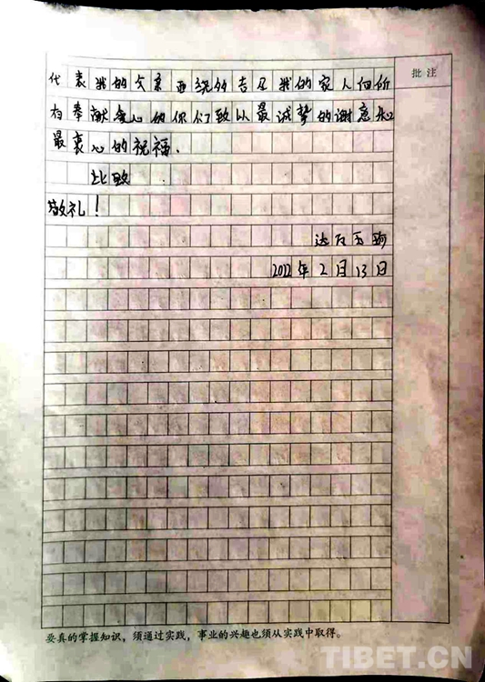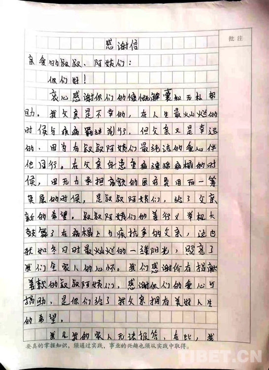 中國(guó)西藏網(wǎng)訊 “親愛(ài)的叔叔、阿姨們,您們好,衷心感謝你們的慷慨解囊和無(wú)私幫助......!”近日,西藏自治區(qū)林芝市巴宜區(qū)更章門(mén)巴民族鄉(xiāng)(以下簡(jiǎn)稱:更章鄉(xiāng))門(mén)仲村村民西繞多吉女兒達(dá)娃玉珍向更章鄉(xiāng)新時(shí)代文明實(shí)踐所發(fā)來(lái)了一封感謝信,字里行間充滿著感激之情,而背后的暖心故事更讓人溫暖與感動(dòng)。