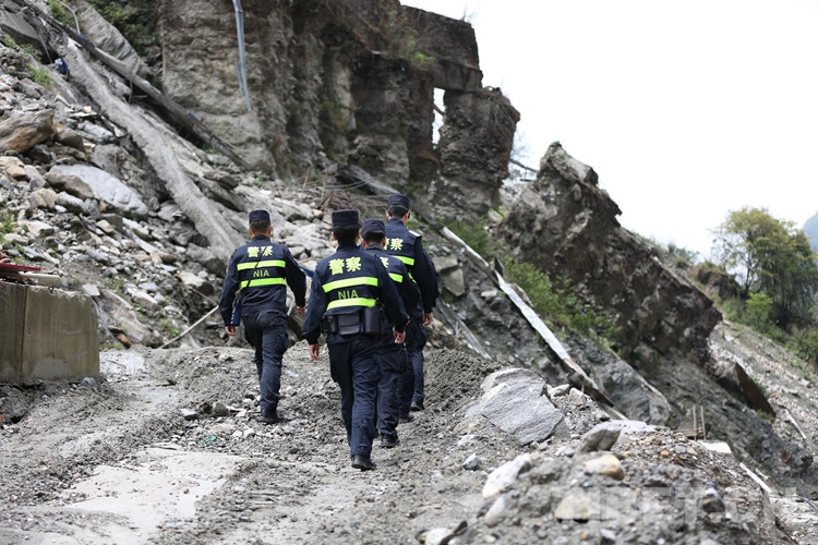 圖為屈鵬帶領(lǐng)所屬民警在口岸泥石流地段進行巡邏